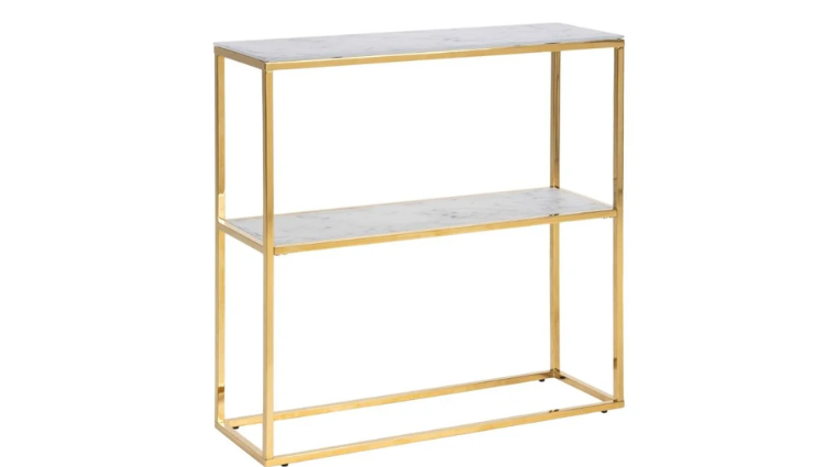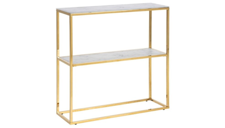 Opal Console Table with White Crystal Clear Marble Glass Top & Gold Legs.