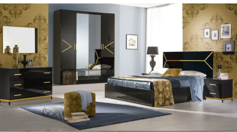 Ben Company Elegance Black and Gold Finish Italian Bed Group Set with 4 Door Wardrobe