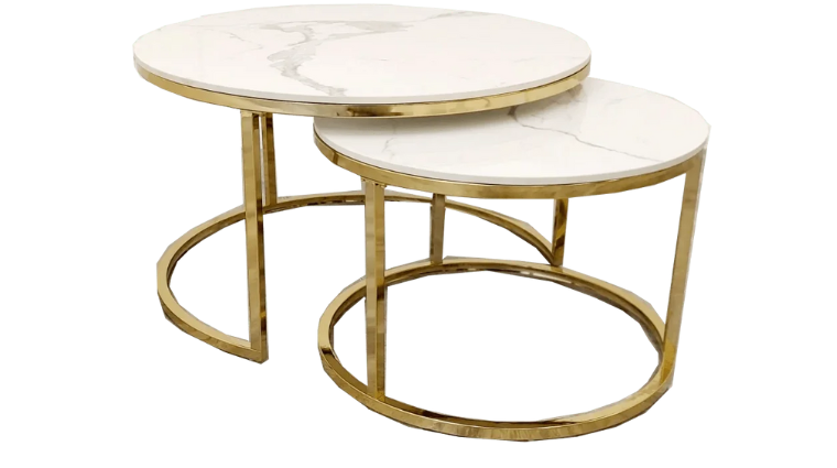 The Cato Nest of 2 Short Round Coffee Gold Tables with Polar White Sintered Stone Tops from Artisan Furniture Store adds a luxurious and modern touch to any living room. Featuring elegant gold metal frames paired with stunning polar white sintered stone tops, these tables exude sophistication and style. Their compact, nestable design makes them perfect for both large and small spaces, offering flexibility and functionality. The smooth, durable stone surface is easy to clean and resistant to wear, ensuring long-lasting beauty.