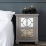 Bring sumptuous sophistication to your decor with our deco-inspired HUSK- 2 Drawer Mirror Cabinet in the mirror with champagne geometric design and trim and crystal knob handles. Luxurious and elegant, either on its own or with another item from the range, its ample storage will add a decadent appeal to your bedroom.