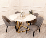 If you’re after a more compact design or simply lacking in space, choose our Juno 90cm Round Dining Table. This small but stylish table features a simple Polar White Sintered Stone Top with a subtle light grey grain detail. A cross over gold base finishes off his design. This table will comfortably fit 4 chairs around. Ideal for apartments or small dining areas.