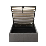 The Miami Ottoman Storage Bed is upholstered with a beautiful rich grey fabric arranged in slotted positions to add a touch of elegance and luxury to any bedroom.