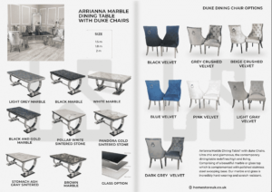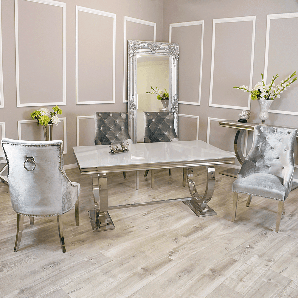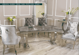 Arrianna Marble Dining Table? with duke Chairs. Ultra chic and glamorous, the contemporary dining table redefines high end living. Comprising of a beautiful marble or glass top which is complemented with polished stainless steel swooping base. Our marble and glass is incredibly hard-wearing and scratch resistant.