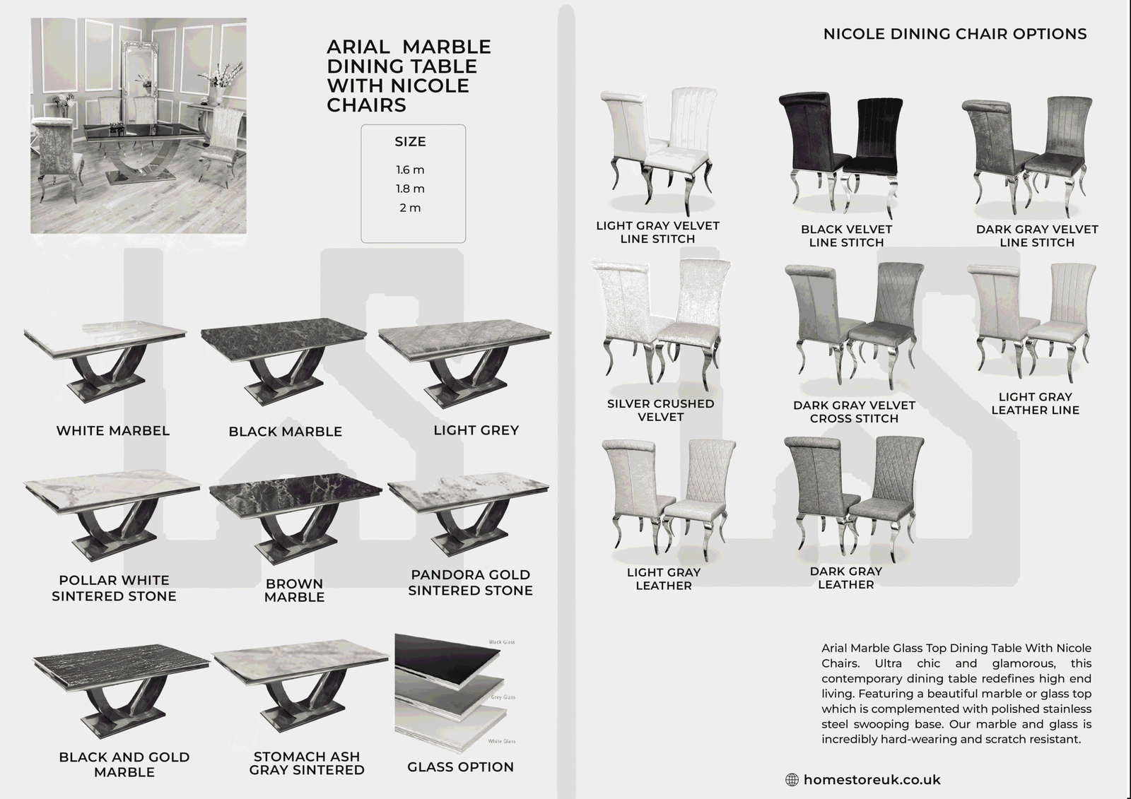 Arial Marble Glass Top Dining Table With Nicole Chairs. Ultra chic and glamorous, this contemporary dining table redefines high end living. Featuring a beautiful marble or glass top which is complemented with polished stainless steel swooping base. Our marble and glass is incredibly hard-wearing and scratch resistant.round marble dining table