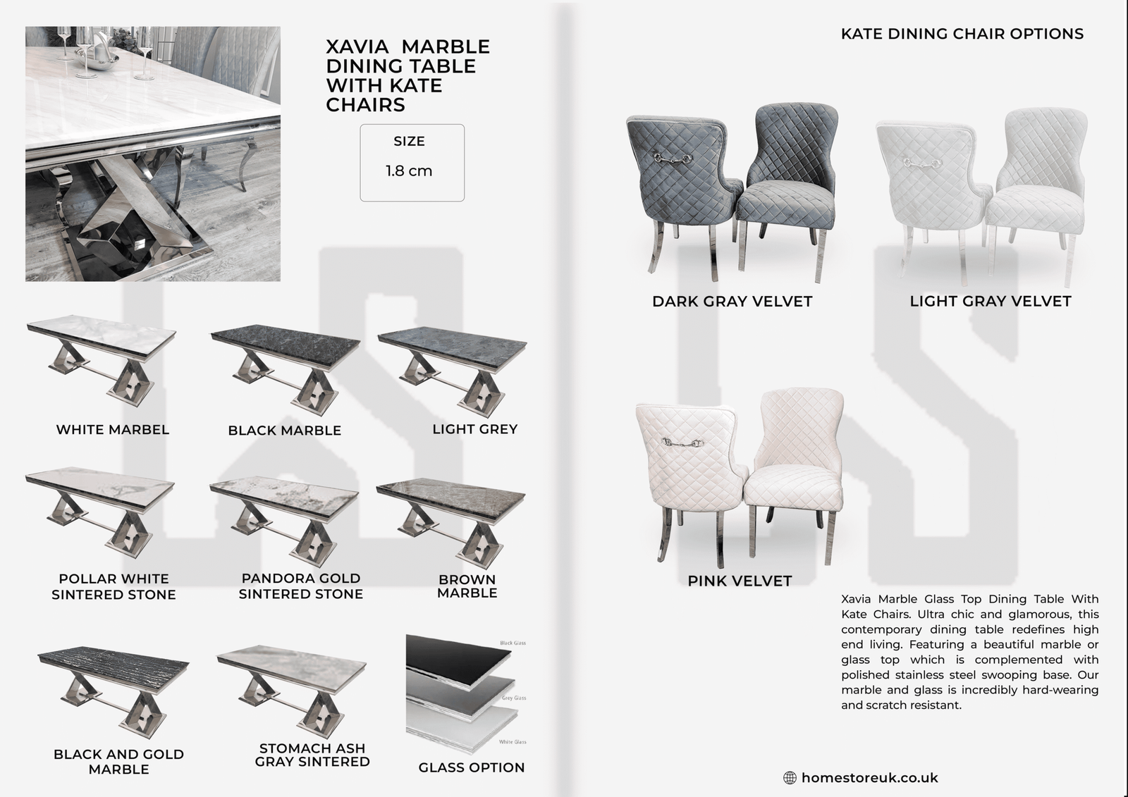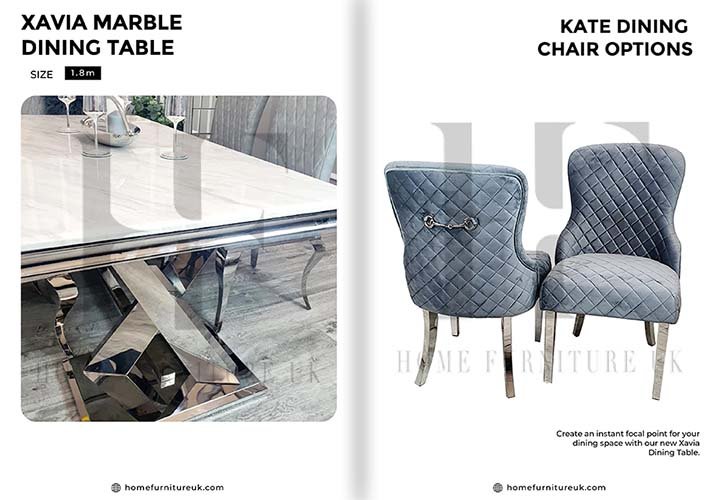 Create an instant focal point for your dining space with our new Xavia Dining Table. Ultra chic and stylish, this contemporary dining table redefines high end living. Comprising of a beautiful 1.8 meter top which is available in a selection of marble or glass. Complemented with a polished stainless steel double x leg base. Our marble, Sintered Stone and glass tops are incredibly hardwearing and scratch resistant. The sleek lines and smooth materials make the Xavia Dining Table an easy to clean piece of furniture. This dining table comfortably seats six dining chairs.